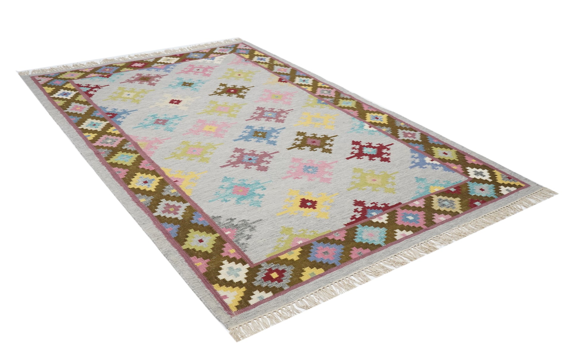 This eye-catching piece features a unique kilim-style geometric pattern in a joyful mix of pastel tones and earthy contrasts, handwoven by skilled Indian artisans using traditional techniques passed down through generations. The 100% wool construction ensures a soft underfoot feel, while the flatweave texture makes it durable and easy to maintain—ideal for both contemporary and eclectic interiors.